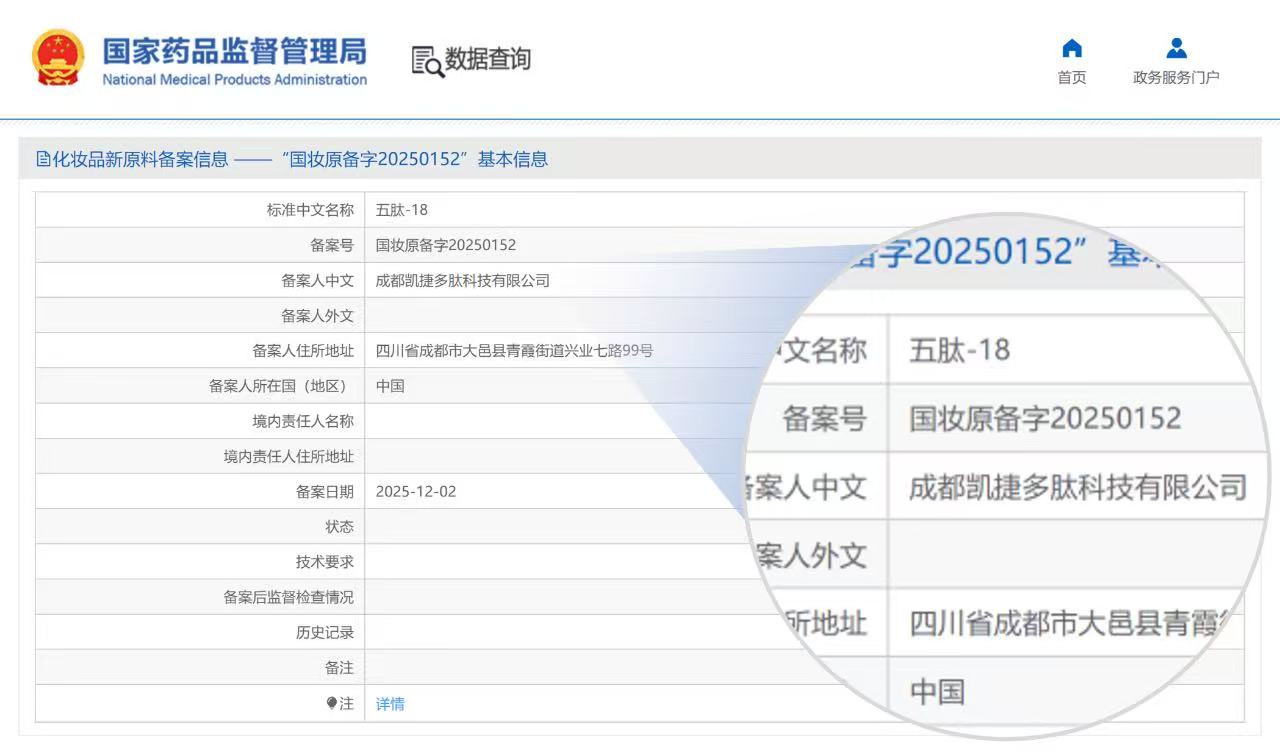 12月2日,圣诺生物化妆品新原料“五肽-18”(国妆原备字20250152)正式通过国家药监局备案!目前,圣诺生物全资子公司-成都凯捷多肽科技有限公司共成功备案了4款多肽新原料。